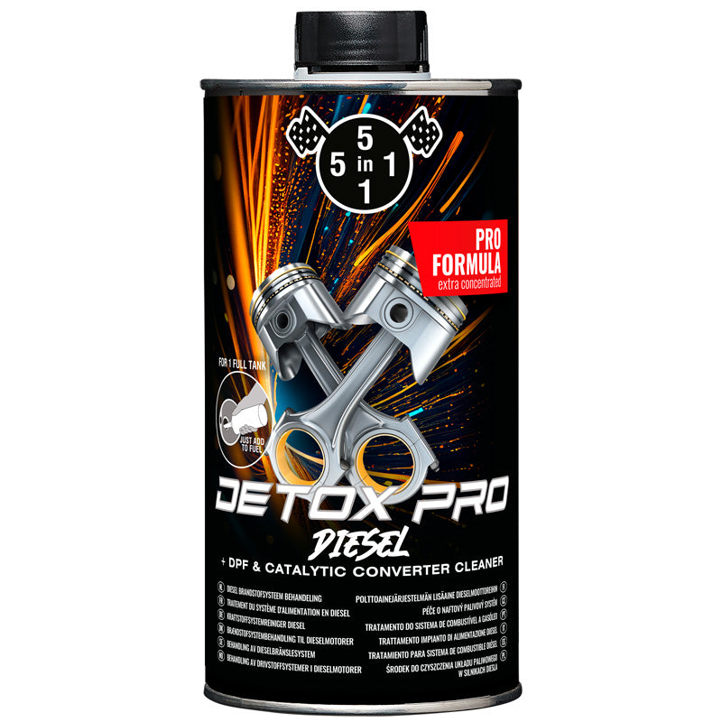 5in1 Diesel Detox Pro er en avanceret rengøringsløsning designet til den nye generation af dieselmotorer. Dette multifunktionelle produkt tilbyder en effektiv behandling, der adresserer de mest almindelige forureningsproblemer i moderne dieselmotorer. Med en kombination af specielle additiver renser det ikke kun brændstofsystemet, men forbedrer også brændstofeffektiviteten og motorens pålidelighed.