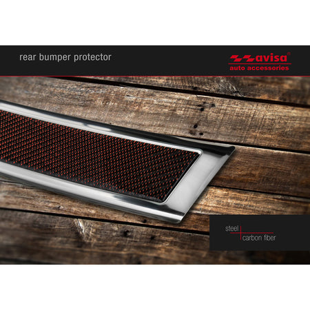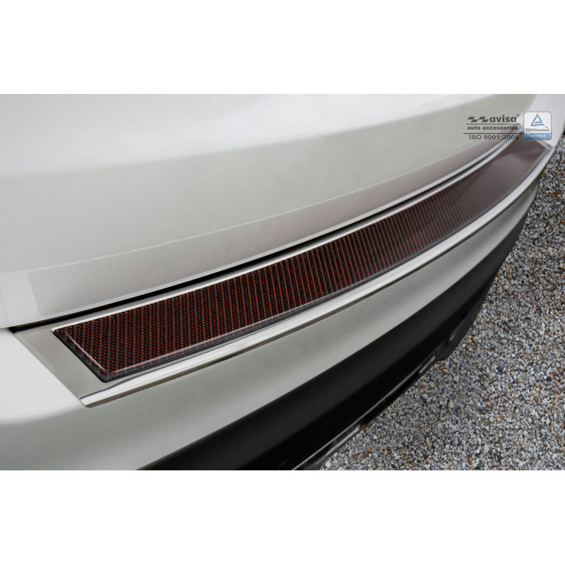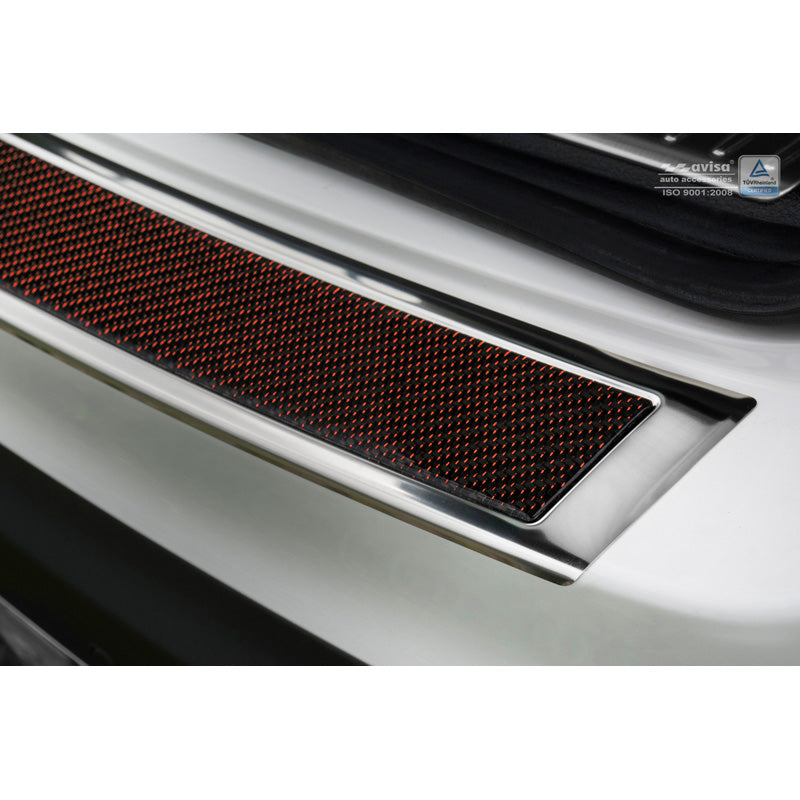Bagkofangerbeskytteren er skræddersyet til din bilmodel og sikrer en præcis pasform, hvilket giver optimal beskyttelse til det udsatte område på din bagkofanger. Med et elegant design i rustfrit stål og en kombination af rød-sort kulfiber, tilføjer den et sporty præg til din bil.