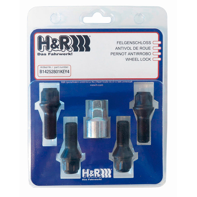 H&R, Wheel lock set M12x1.50x30mm Taper Black - 4 wheel lock bolts incl. adapter