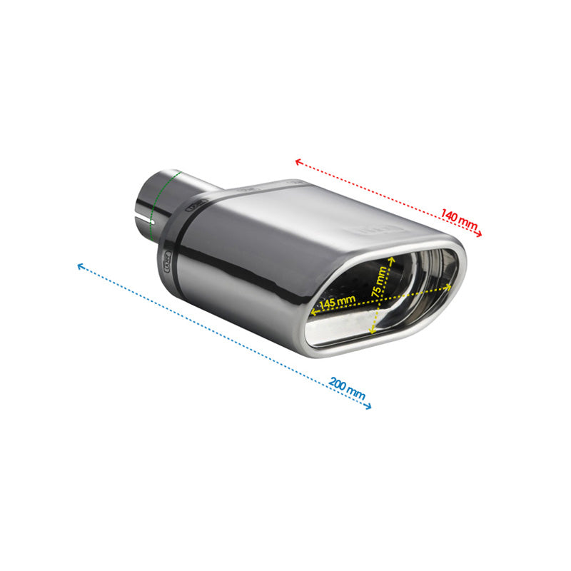 Med en diameter på 145x75mm og en længde på 140mm, er denne rørhale designet til at give et sporty look, samtidig med at den sikrer optimal udstødningsflow. Den er let at installere med en tilslutning på over 50mm, hvilket gør det til en praktisk opgradering for enhver bil.