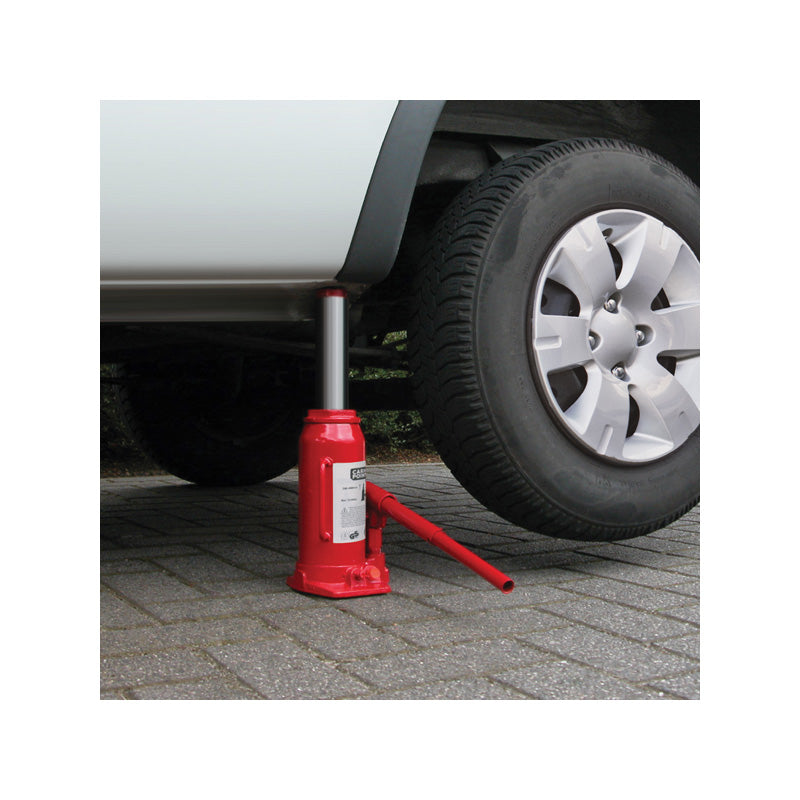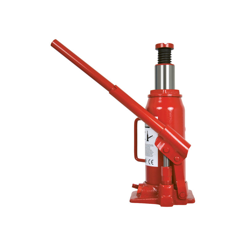 Domkraften är fylld med olja och enkel att manövrera tack vare den dubbla pumparmen. Övertrycksventilen ser till att flaskdomkraften inte överbelastas, vilket ger dig sinnesfrid under användning. För optimal säkerhet rekommenderas det alltid att placera domkraften på en plan och fast yta och att använda axelstativ för att stödja fordonet.