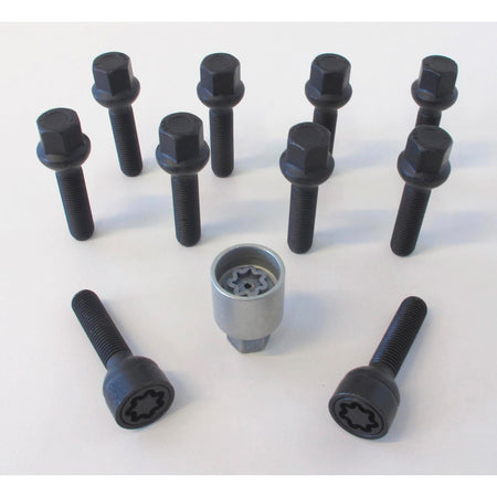 H&R, Hjulbult Set Round-Head R13 M14x1,50 - längd 28mm - Svart - 10 st. (passar ek VAG) - inkl. hjullås
