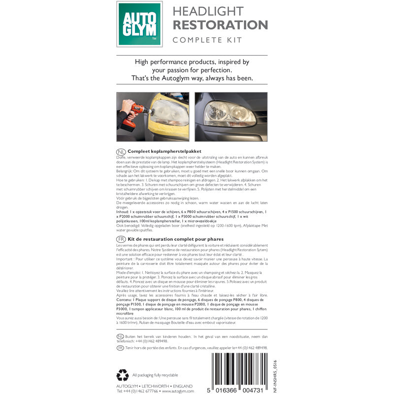 Med Autoglym Headlight Restoration Complete Kit får du ett komplett set för effektiv rengöring och återställning av slöa och slöa strålkastare. Detta kit innehåller allt du behöver för att förbättra sikten och säkerheten för ditt fordon.