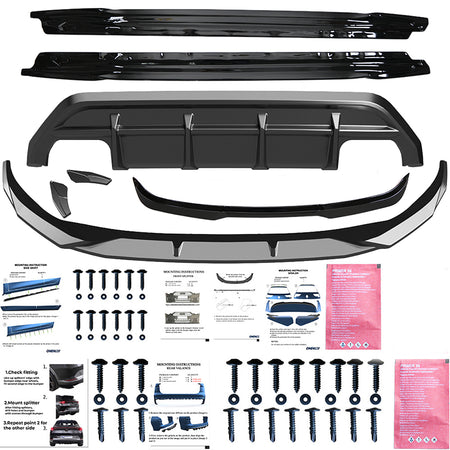 The set includes: front spoiler, roof spoiler, side skirts, diffuser, rear side splitters