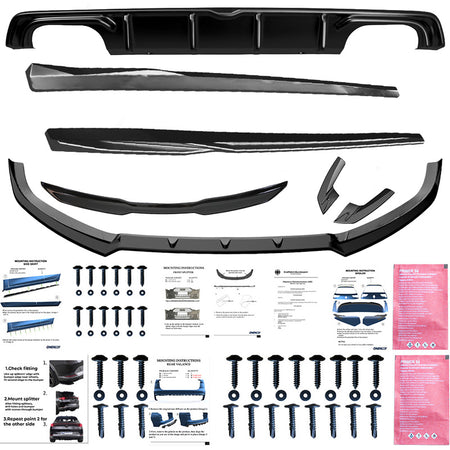 The set includes: front spoiler, rear spoiler, side skirts, diffuser, rear side splitters
