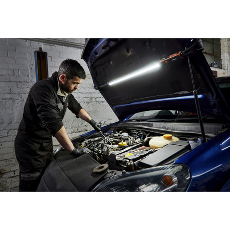 Med en skyddsklass på IP65 är denna lampa skyddad mot inträngning av dammpartiklar och stänkvatten. Den är även testad för slagtålighet enligt IK07. Med en vikt på bara 840 gram och med mjuka kuddar i båda ändar av monteringsstången, är denna lampa designad för att inte skada motorhuven när den används på rätt sätt, vilket gör den idealisk för professionell verkstadsanvändning.