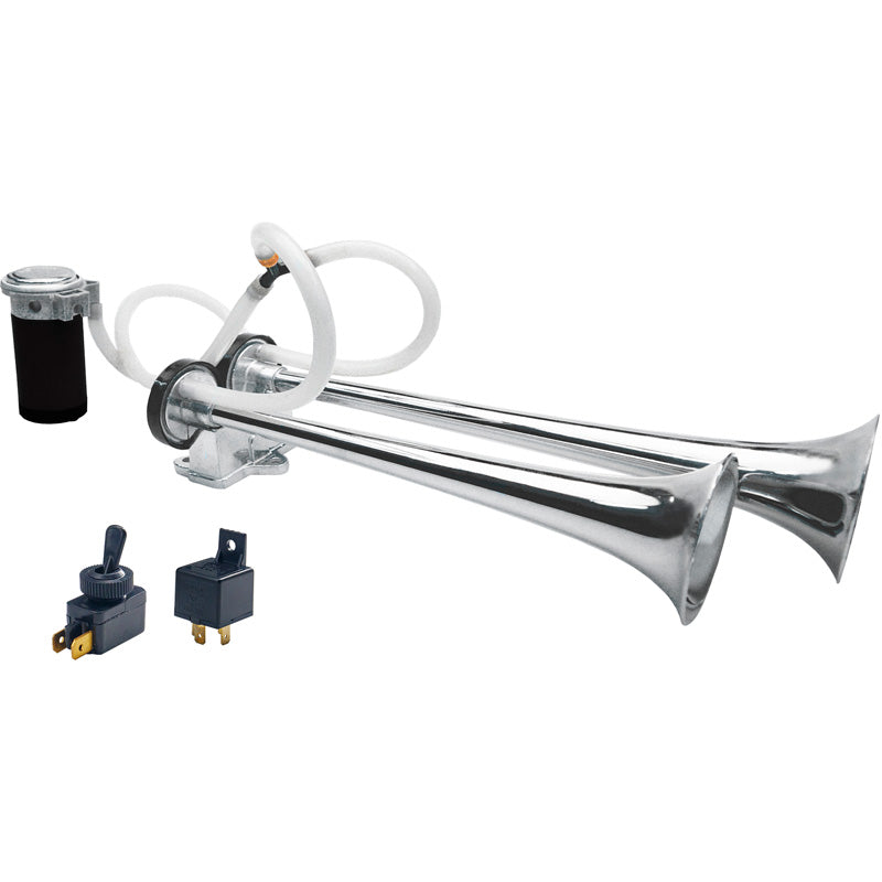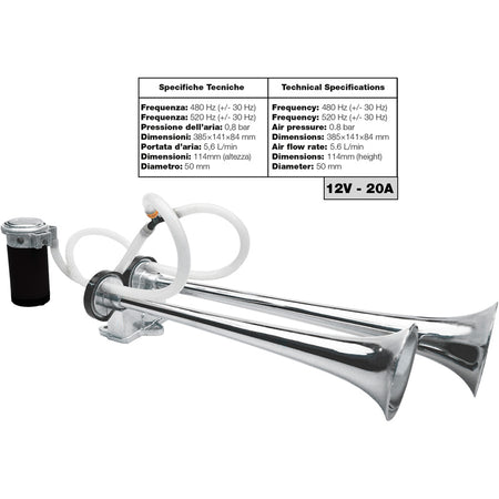 Single-tone 12-volt air horn. Produces a sound of 118 dB. Frequency of the horns are 480 and 520 Hertz. Complete set with 2 air horns, electronic compressor and mounting and connection materials.