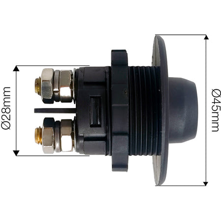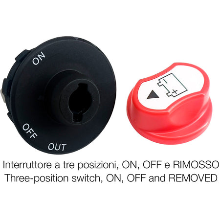 On/Off/Out position Switch. The removable lever allows instant disconnection of master circuit with 12/32V max. 100A. IP56 Rated.