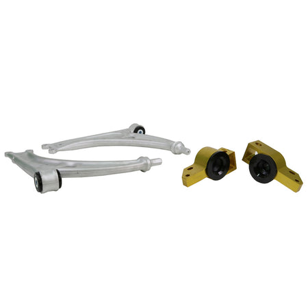Whitelines främre nedre kontrollarmar är tillverkade av högkvalitativ lättviktslegering, vilket minskar vikten jämfört med originaldelar. Den reducerade vikten, delvis osprickad, erbjuder liknande fördelar som lättviktsfälgar. Dessutom har Whiteline optimerad geometri med -0,3 graders camber och +2,0 graders caster, vilket förbättrar hjulinställningen för både gatu- och banprestanda.